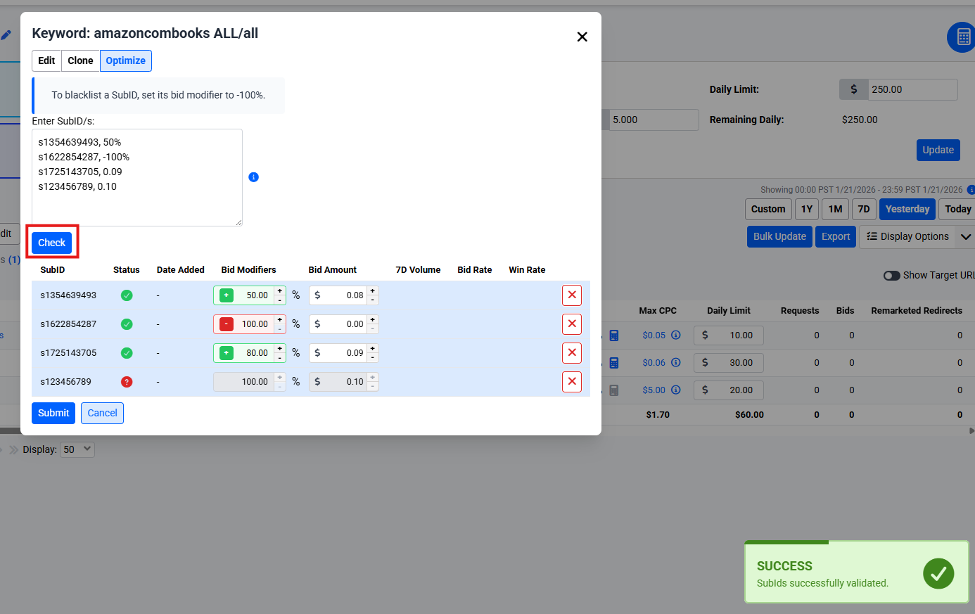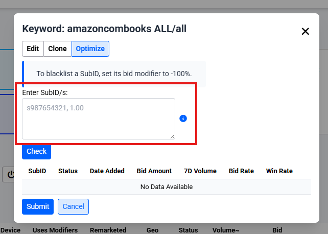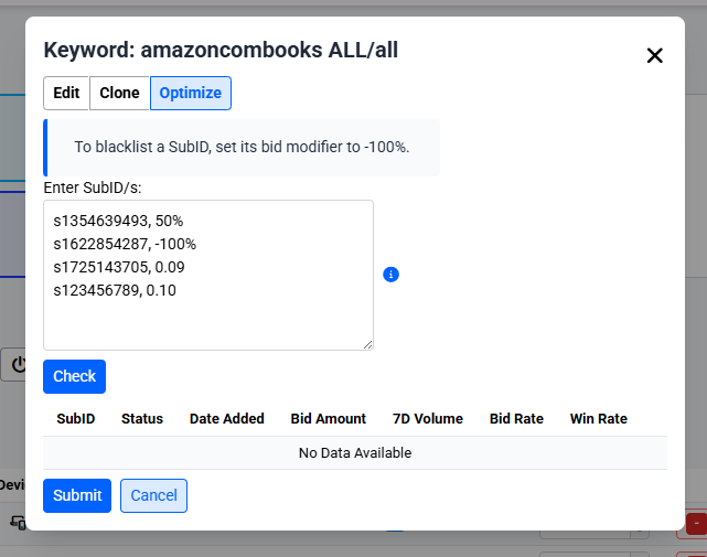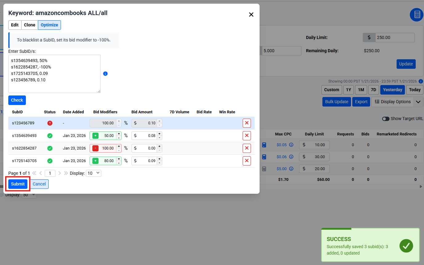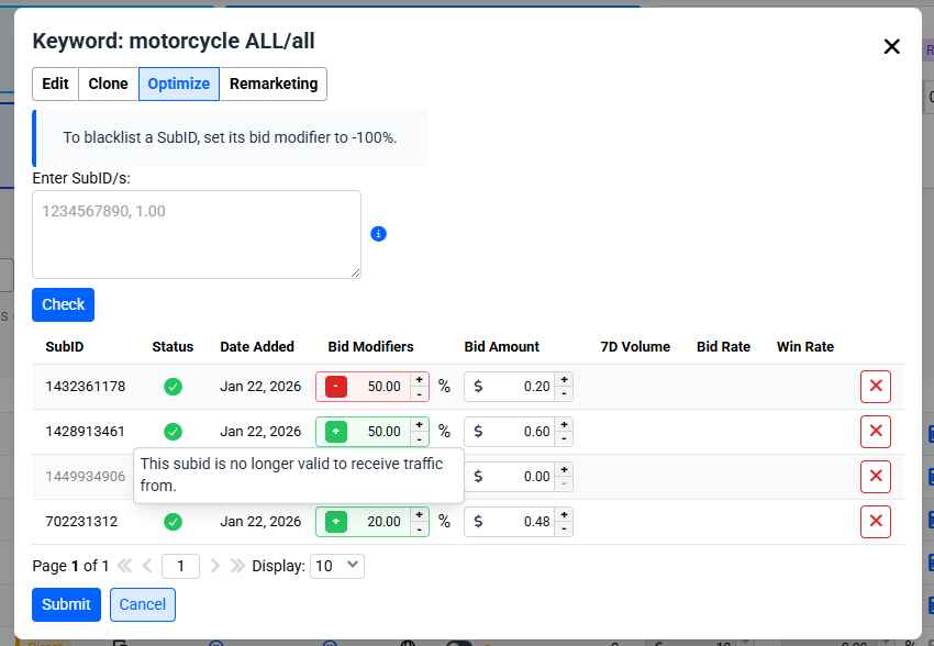 - Blacklisting: Set a bid modifier to -100% to effectively blacklist a SubID