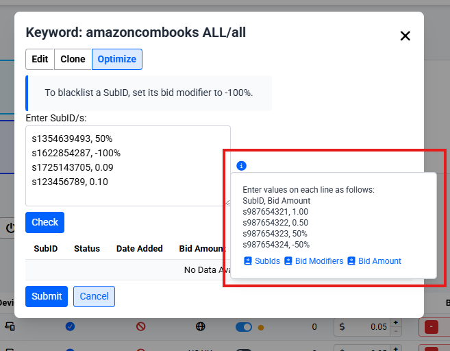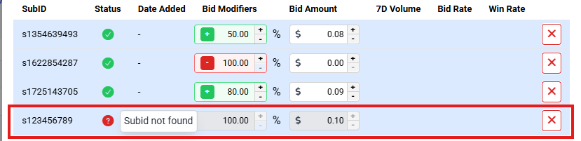 - Inputting only the SubID will set the bid amount to the current campaign bid and 0.00% bid modifier as default. (e.g., s987654321)