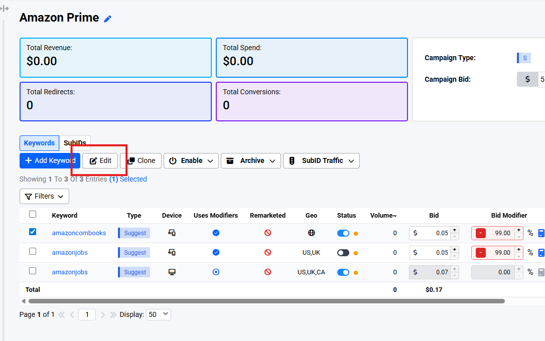 - Bid Modifiers: Editable percentage (if supported)