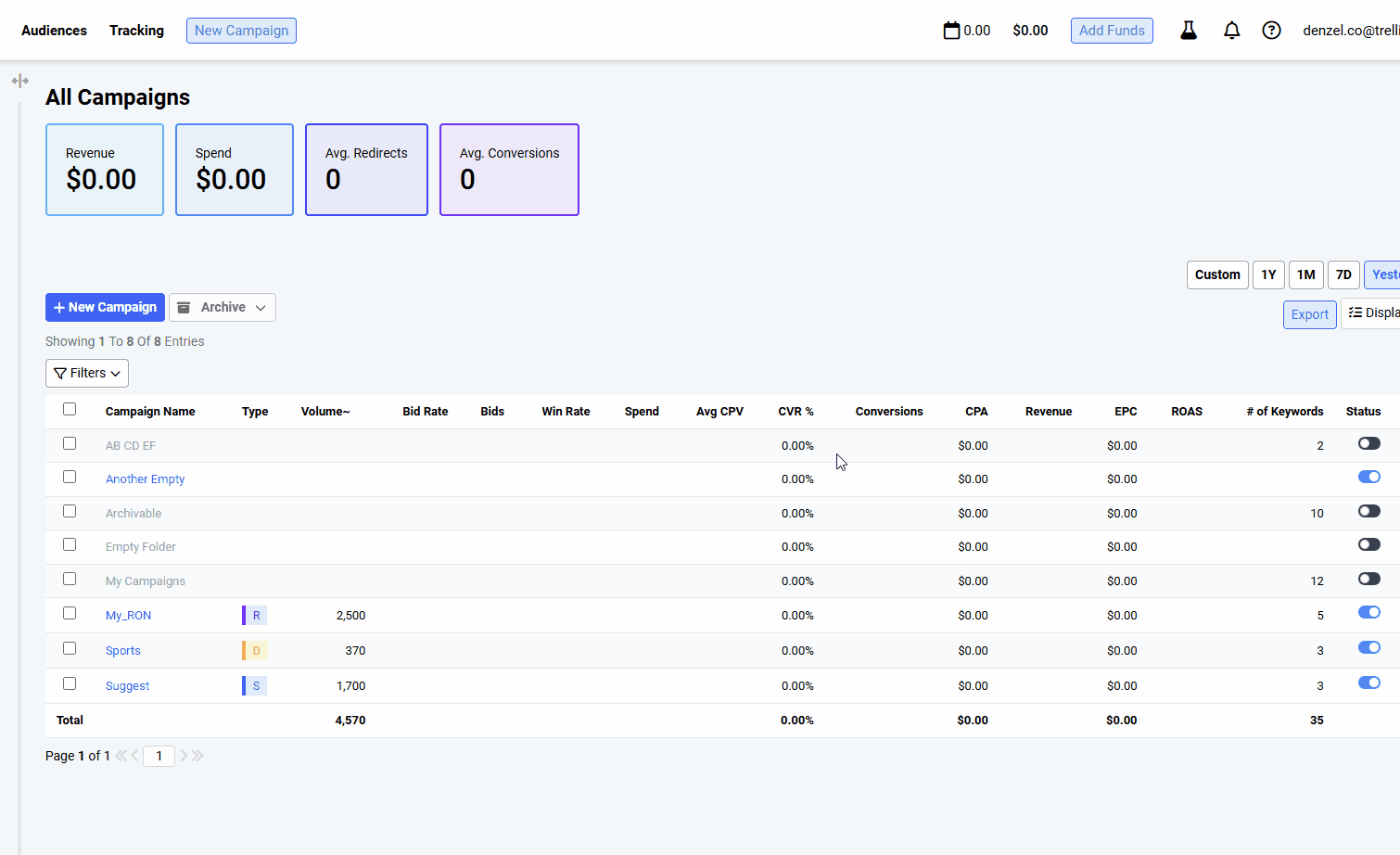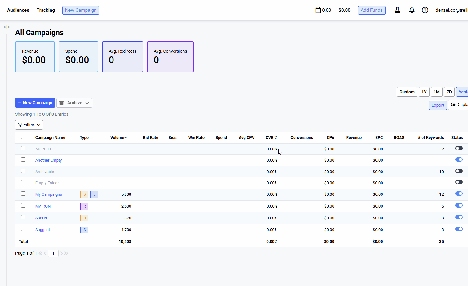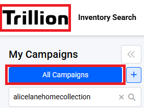 The campaign page allows the user to see the statistics of their campaigns. This page serves as the default dashboard page that the user is greeted when they click on the Trillion logo on the left of the top navigation bar and when they login to the platform.