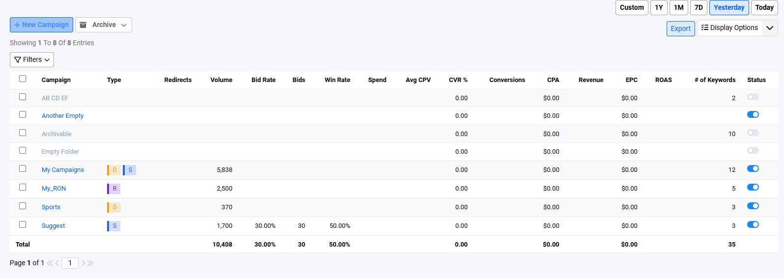 The user can choose to archive certain campaigns from this page. Doing so will disable the campaign and any keywords that are inside it.