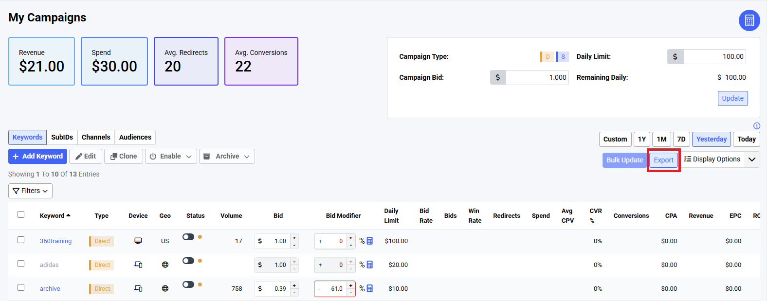 In order to export a report, the user simply needs to click on the export button to trigger the export. After a few seconds a CSV file should have been downloaded to the user's device.