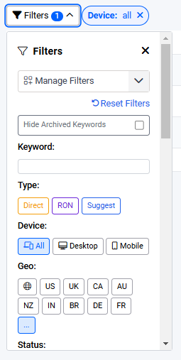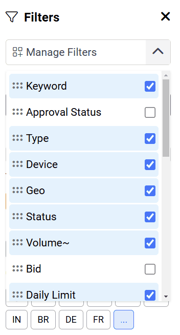 Due to the large number of filters available, a manage filters dropdown has been provided to let the user control the filters that should be displayed as well as how they should be ordered.