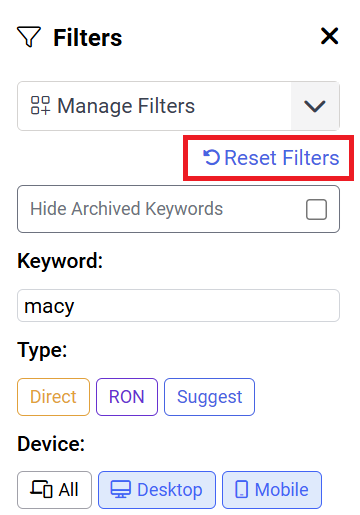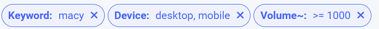 - This filter accepts partial matching. For example specifying macy will still show macys keyword
